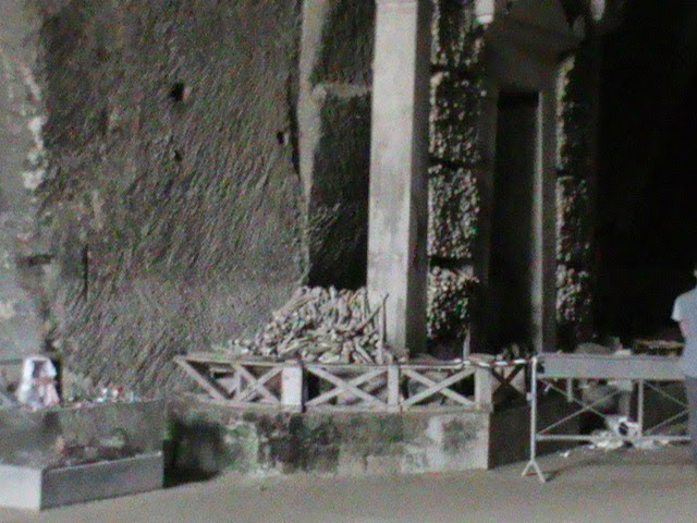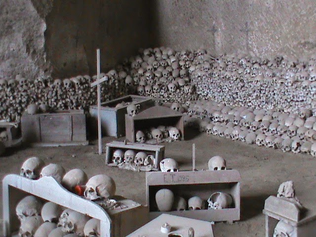 E’, tuttavia, “il cimitero delle fontanelle” a rendere la visita incredibile.Si entra, in fondo, in una galleria di tufo molto suggestiva piena di teschi messi in fila ordinatamente a partire dal 1656 quando, in occasione della peste di cui ho scritto sopra, migliaia di ossa vennero ritrovate da un frate nel vallone in cui confluiva l’acqua piovana.