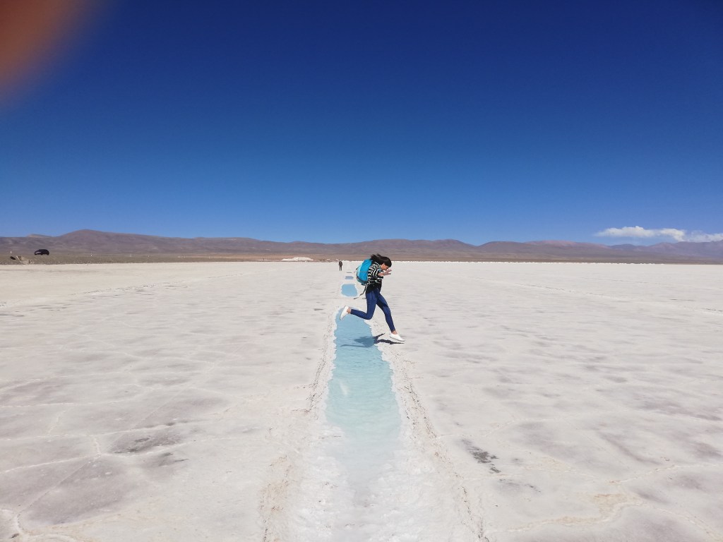 Impossibile descrivere le emozioni che suscita la “Salinas Grandes”, ma a rendere ancora più sensazionale il luogo è la sua origine. La “Salinas Grandes” è, infatti, testimonianza dell’orogenesi delle Ande e della tettonica delle placche. La faccio breve (scusate …… come già detto sono pur sempre un ingegnere), ma laddove c’era il mare, quindi acqua salata, oggi c’è la terra. La “Salinas Grandes” altro non è che quella parte di mare che è rimasta imprigionata nella collisione tra la placca oceanica e quella sudamericana…. il tutto circa 200 milioni di anni fa! Il clima arido e l’assenza di apporti d’acqua regolari fanno sì che oggi, piuttosto che un grande lago salato, possiamo restare letteralmente abbagliati da una gigantesca distesa bianca e lucente ubicata a 4.000 m di altitudine, la Salinas Grandes appunto. Perdonate la digressione, ma, a mio avviso, la bellezza del luogo è resa ancora più sensazionale dal fatto di poter toccare con mano ciò che da bambini si apprende nelle prime nozioni di geografia. Dopo una passeggiata sulle lastre di sale che si alternano ai piccoli pozzi d’acqua cristallina e qualche scatto in cima ai cumuli di sale, nelle vicine miniere potrete acquistare qualche piccola scultura in …. sale. Io ho comprato un cactus e simpaticissimo lama.