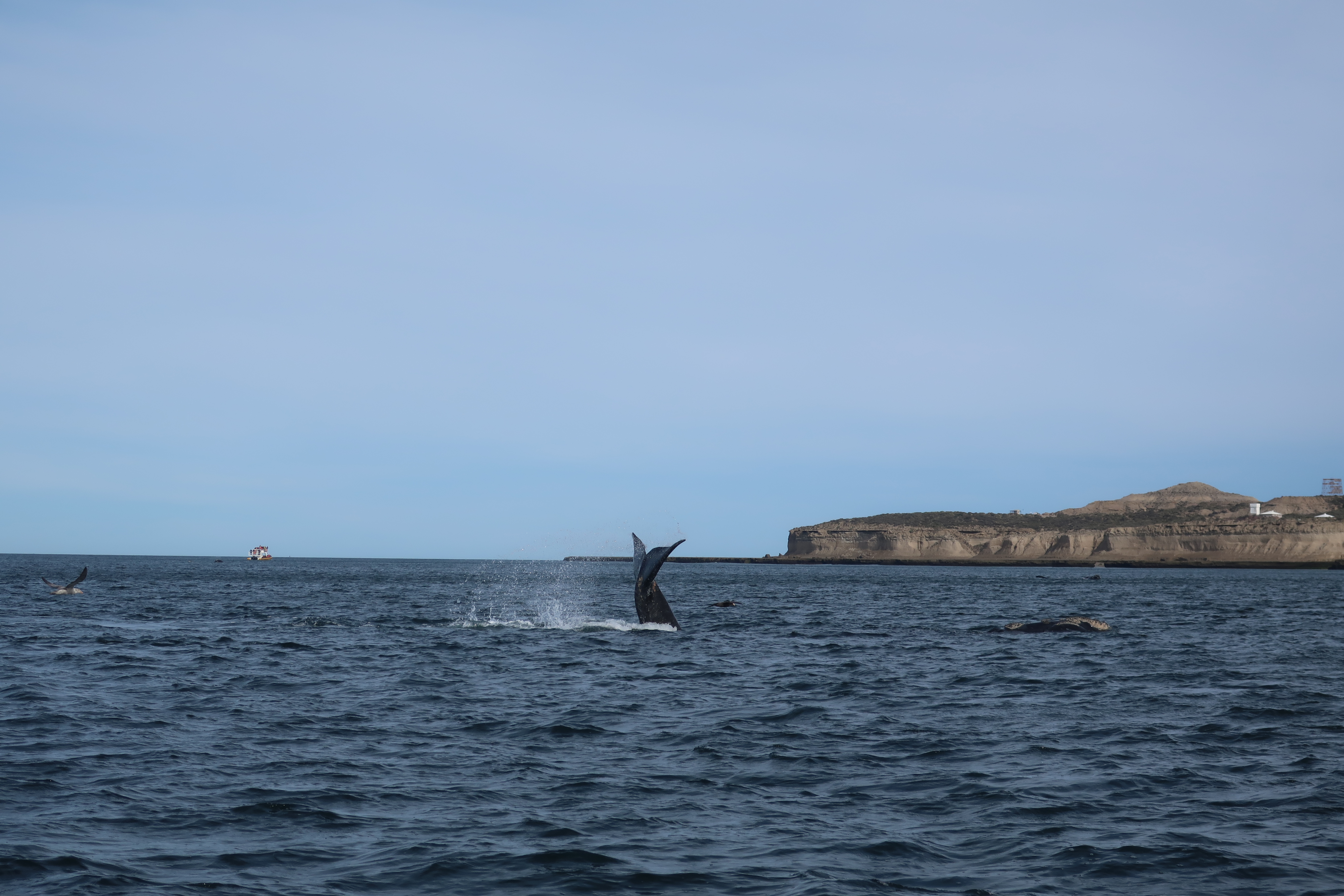 La gita continua verso Puerto Piramides. Da questo momento la vostra gita svolterà letteralmente. Vi recherete infatti su una grande spiaggia melmosa (d’estate meta di numerosi bagnanti….sigh) circondata da un costone roccioso su cui svettano numerose guglie piramidali. Sulla spiaggia sono presenti delle imbarcazioni, delle pilotine di medie dimensioni, collegate a un sistema di doppi binari. Sostanzialmente, indosserete il giubbino di salvataggio, salirete sulle imbarcazioni e….via…. i binari trascineranno l’imbarcazione in mare. Se fin qui è tutto più o meno normale, arrivati a pochi metri dalla terra ferma ecco lo spettacolo! Vi troverete circondati da Balene Franco Australi!!!! L’emozione è unica, ma prima di entrare nel merito della mia esperienza, anche qui, un cenno sulle abitudini di questo enorme cetaceo sarà utile per programmare il periodo del vostro viaggio alla Penisola di Valdès. La Balena Franco Australe raggiunge circa i 14-18m di lunghezza di cui circa 1/3 è composto dalla testa dell’animale e si caratterizza per il colore nero scuro alternato da alcune escrescenze di colore biancastro che sono utilizzate dai ricercatori per catalogare e monitorare i singoli esemplari. Come le altre specie marine che popolano la Penisola di Valdès, la balena franco australe è migratoria: essa vive abitualmente nella zona antartica più ricca di plancton e krill e giunge sulle sponde patagoniche nel periodo invernale per riprodursi e partorire in mari più calmi e temperati. In ogni caso, la Balena Franco Australe popola la penisola di Valdès nel periodo tra maggio e dicembre, così da potersi accoppiare, partorire e svezzare i propri cuccioli in tutta tranquillità. I cuccioli di balena, dopo una gestazione di circa 12 mesi, vengono al mondo nel periodo tra giugno e settembre. A partire dal mese di ottobre, quando i cuccioli hanno raggiunto una grandezza sufficiente, i piccoli branchi di balena (dai 2 ai 10 esemplari compresi madri e figli) tornano in mare aperto e si dirigono verso sud. A dicembre il ciclo migratorio è essenzialmente concluso e la balena franco australe ha definitivamente abbandonato l’isola di Valdès per farvi ritorno nella primavera successiva. Il periodo ottimale per ammirare la balena franco australe alla penisola di Valdès è, dunque, compreso tra la seconda metà di giugno e la prima metà di novembre. Personalmente ho visitato la Penisola di Valdès a fine settembre e lo spettacolo è stato garantito. Ciò premesso, torniamo a noi. Dicevo, a pochi metri dalla spiaggia di Puerto Piramides ho potuto ammirare numerose balene, anzi numerose mamme balena, nuotare beatamente con i propri cuccioli al seguito. Il mare calmo della baia, infatti, fa sì che le mamme prediligano la zona allattare i propri piccoli rilasciando il latte materno, estremamente denso, in acqua, così che i piccoli non riscontrino alcuna difficoltà nel nutrirsi. Riconoscerete i cuccioli di balena sia per le dimensioni che per il colore più chiaro rispetto agli esemplari adulti.  In ogni caso, vedere questi splendidi animali sbuffare, volteggiare in acqua e mostrare continuamente coda e pinne è un’emozione è unica ed indescrivibile.