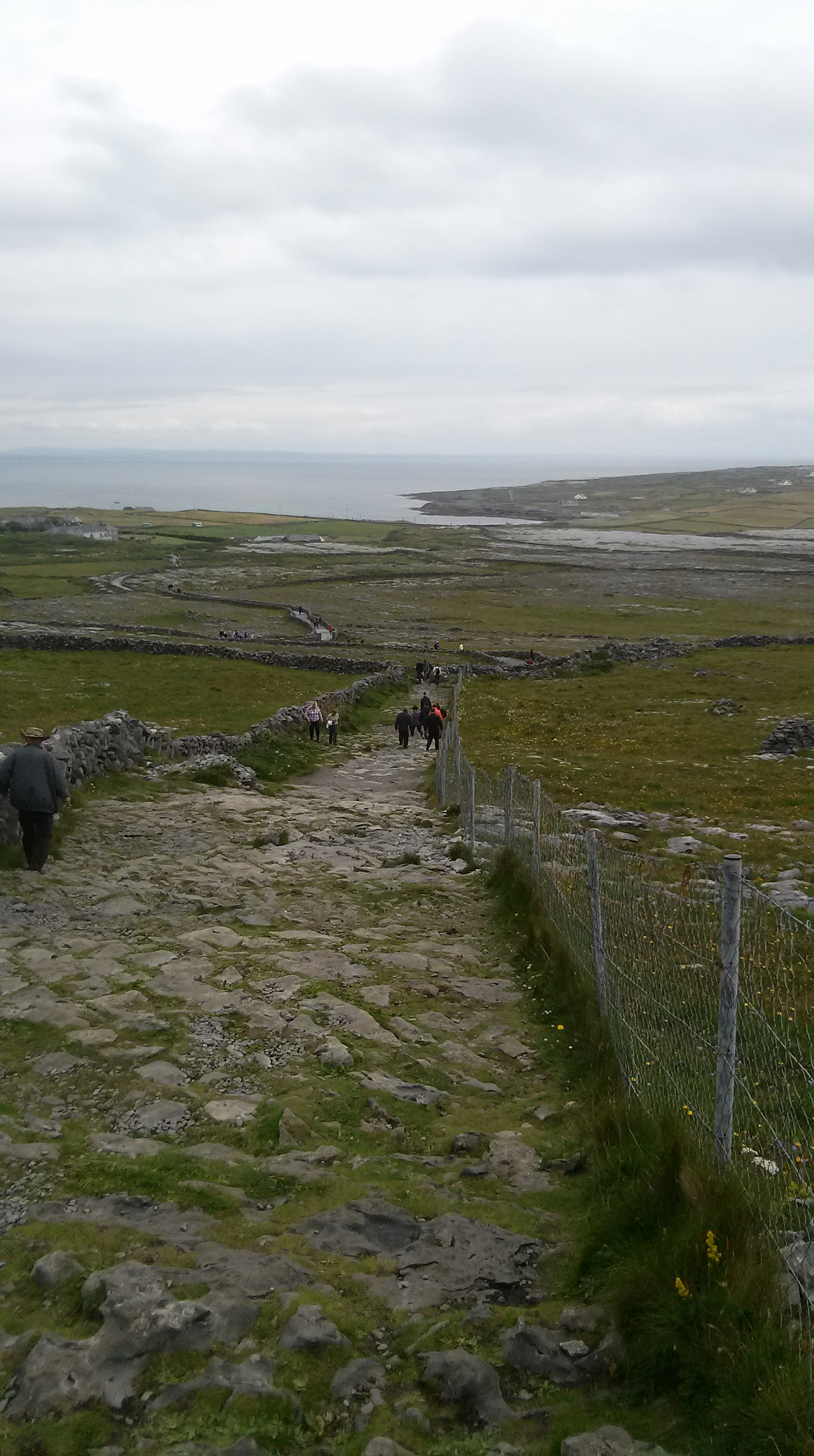 La vera attrazione della giornata però – oltre alle cliffs of Moher – sono tuttavia le isole Aran, 8 isole che si trovano posizionate in fila proprio di fronte a Doolin. Esse rappresentano l’archetipo della vita dura, dove l’inclemenza degli agenti atmosferici ha reso eroica la resistenza dell’uomo. Tanto è vero che qui nel 1934 Robert Flaherty ha realizzato un celebre documentario intitolato “l’uomo di Aran” per evidenziare le difficoltà di vita dei pescatori che qui vivevano e io…nelle 2 volte in cui vi sono andato ho beccato la pioggia. Ciò premesso, quasi tutti i visitatori vanno a ragione su Inishmore, la maggiore delle isole Aran, dove troveranno un paesaggio brullo, ma affascinante in cui i muretti lungo il percorso sono intervallati da scogliere a picco sull’oceano. E’ strano per noi mediterranei trovarsi su un’isola e poi imbattersi in pecore, mucche e cavalli. Per girare l’isola – non essendoci automobili – è altamente consigliato noleggiare una bicicletta. Da visitare vi è sicuramente il Dun Aengus, un’antichissima fortezza dell’VIII sec. a.c., che regala uno dei più bei panorami dell’isola.