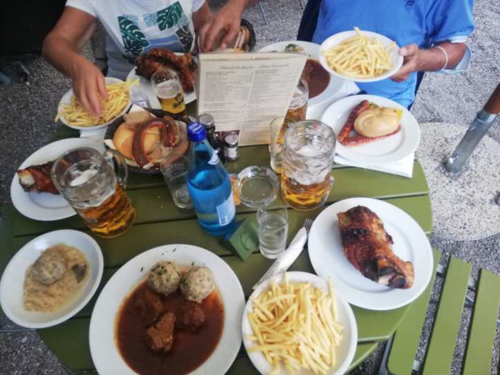 Dopodiché si può passare al grosso grasso cibo da pub. Tra le cose più interessanti abbiamo : stinco di maiale con crauti, salsicce, wurstell, canederli, goulash con patate. Tutto appunto grosso e pure grasso, ma altrettanto decisamente saporito ed in grado di raggiungere lo zenit dei grassi saturi. La serata scorre così dolcemente così come i litri di birra cui si fa fatica a dire basta.