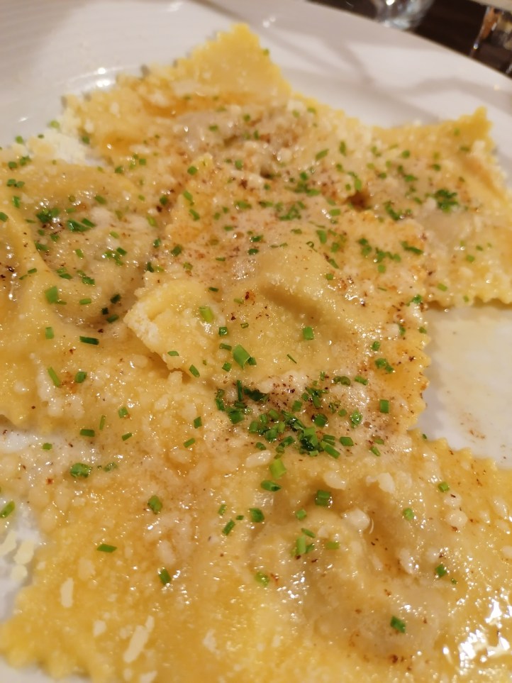 Ciò posto, punti forti della premiata ditta sono i ravioli, gli gnocchetti ed i tortelli fatti in casa, spesso ripieni di spinaci o finferli su un letto di burro: davvero saporiti. Le porzioni abbondanti sono poi una piacevole costante che devono essere limitate al solo scopo di lasciare spazio ad altro. In questo ristorante il rischio di rialzarsi con la necessità di aggiungere un buco alla cintura è invero sempre concreto, posto che gli amanti della montagna avranno la sensazione di assumere le calorie sufficienti per sopportare il fabbisogno energetico dei prossimi due inverni.